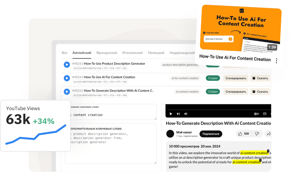 Продвигайте свой продукт с помощью уникальных YouTube видео. С автоматическим AI переводом, дубляжом и готовым SEO контентом.